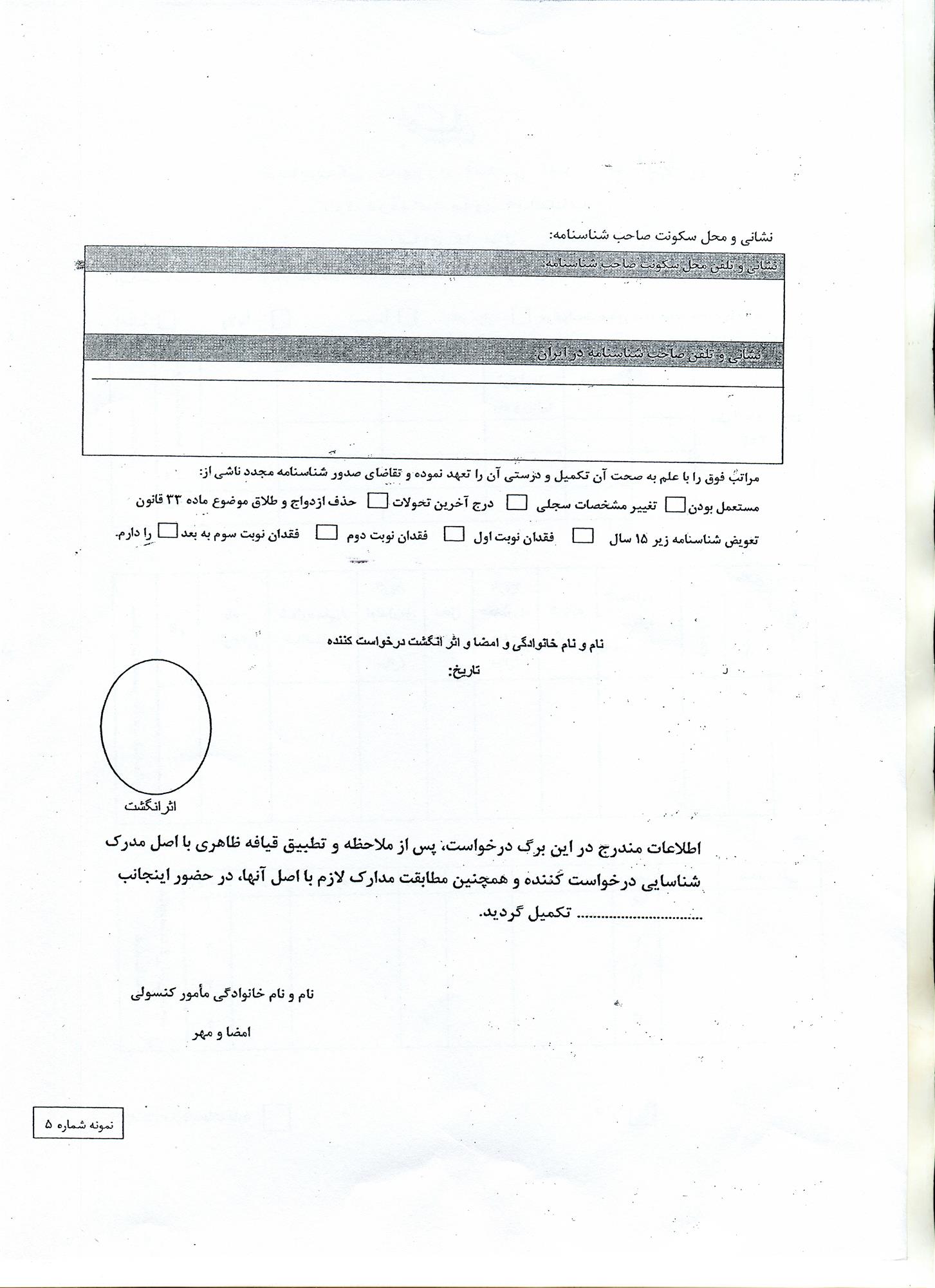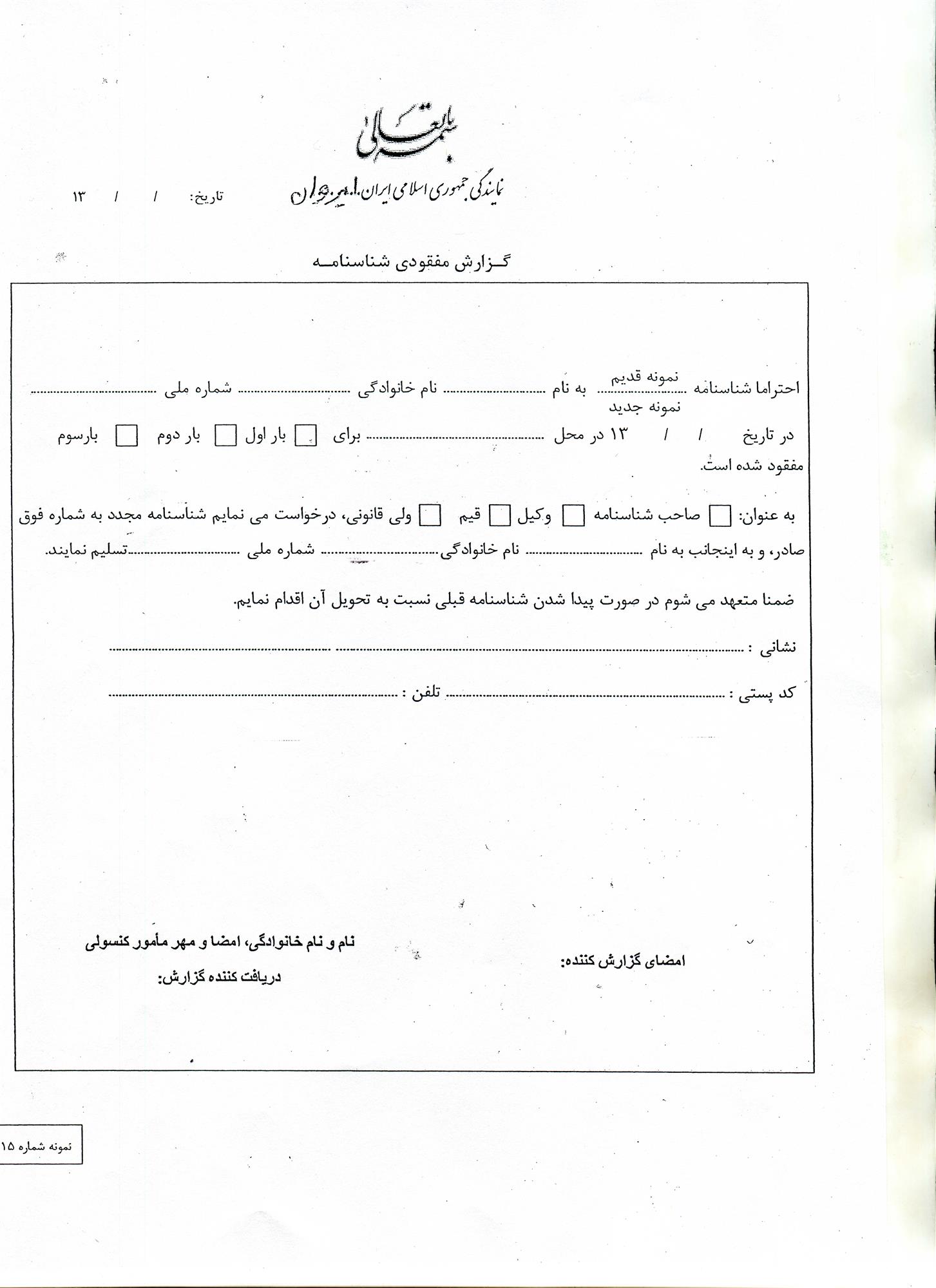 1) تکمیل برگ درخواست صدور شناسنامه ( فرم دریافت المثنی شناسنامه1 - المثنی شناسنامه 2 و فرم گزارش مفقودی )