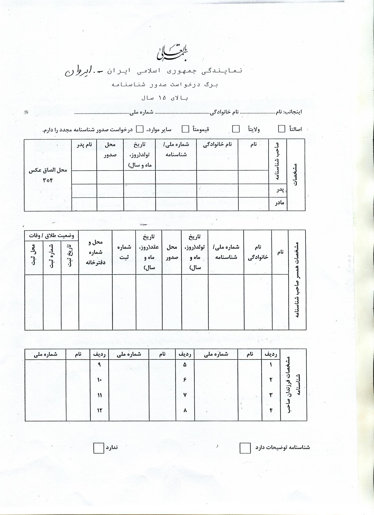 درخواست شناسنامه المثنی برای متقاضیان زیر 18 سال باید از سوی پدر، جد پدری و یا قیم قانونی