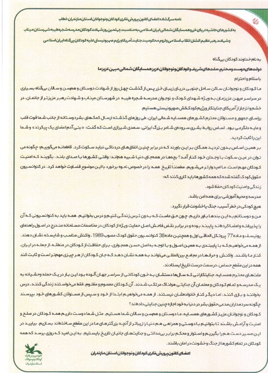 نامه اعضای کانون پرورش فکری کودکان و نوجوانان استان مازندران در خصوص شهادت مظلومانه کودکان مدرسه میناب