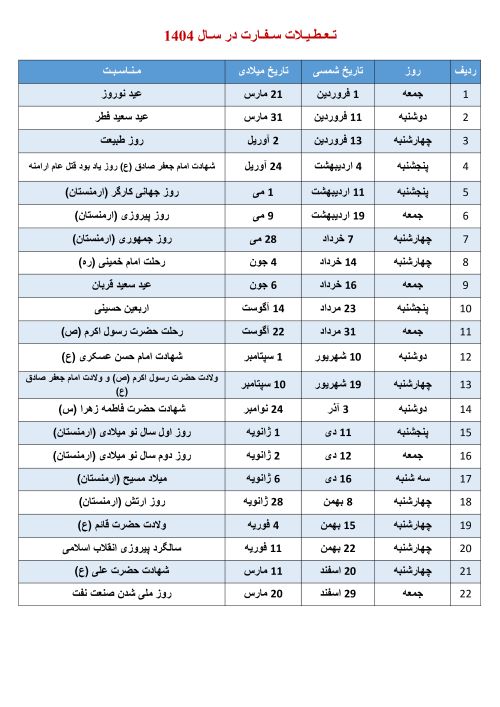 روزهای تعطیل سفارت جمهوری اسلامی ایران در سال 1404