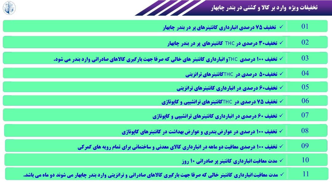 فهرست بروز شده تخفیفات ویژه انبارداری،عوارض بندری و عوارض بهداشت در بندر چابهار برای تجار و فعالان اقتصادی